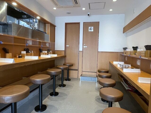 店内は厨房前に真っ直ぐなカウンター7席(5・間・2)、壁に向かったカウンター10席(5・給水機・5)。