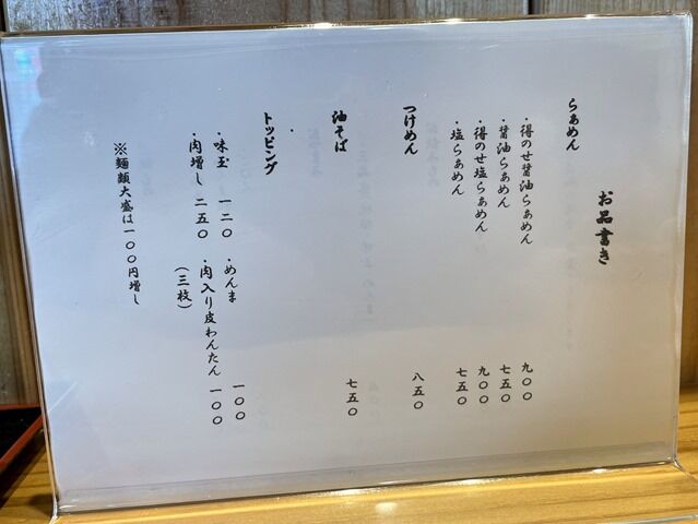 入店するとまず券売機で食券購入です。主なメニューは醤油らぁめん750円、塩らぁめん750円、つけめん850円、油そば750円、他。