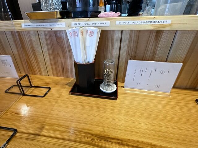 BGMはポップス。箸は紙袋入りの割り箸。卓上調味料はミル入りミックスペッパー。マスクを直に卓上に置くのは禁止。