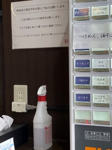 カウンターは1席ごとにアクリル板の仕切りあり。カウンターには椅子が5つありますが、間隔を取って4席で営業の模様。消毒液は券売機横に配置。