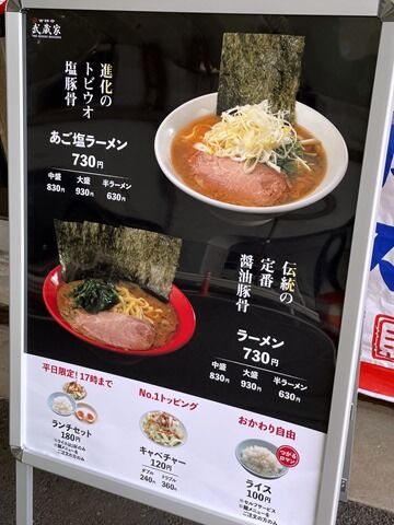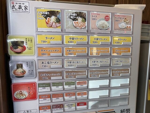 列び中に食券を買うように案内されて店内へ。主なメニューはラーメン730円、あご塩ラーメン730円、ライス100円(おかわり自由)、キャベチャー120円、吉祥寺盛り(全部のせ)250円、他。