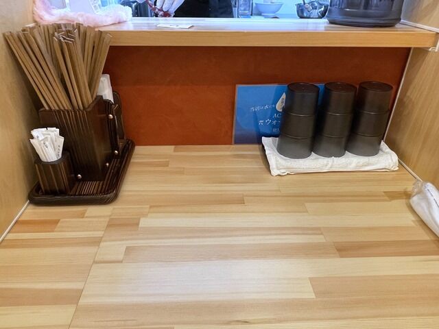 店内は厨房前に真っ直ぐなカウンター7席。1席毎に取外し可能な巨大なパーティションで仕切られていて、ここは一蘭かってほどの個室感。新店でおそらく仕切りデカイで賞大賞本命。