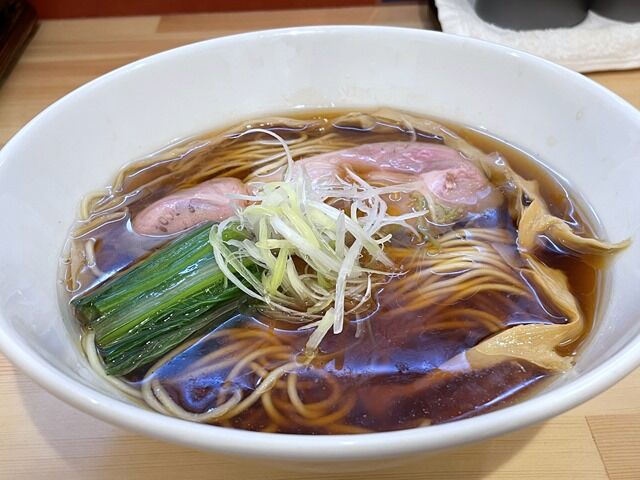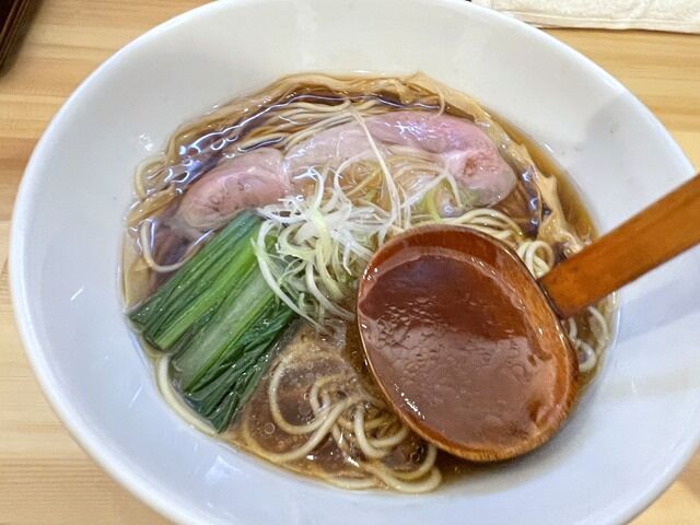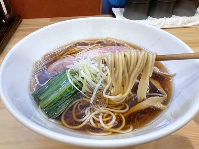 スープはさらさらの清湯醤油味。熱々での提供。分かりやすい秋刀魚フレーバーやサンマ味ではなく、節系強めなシフト。そっくりな味をどこかで食べた記憶がありますが、店名が思い出せず。出汁も香味油もガッツリ魚介に寄せた、ちょっとオイリーで醤油強め、淡麗ながらメリハリとアクセントのあるハイレベルで個性的な味わいでとても美味しい!