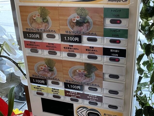 入店するとまず券売機で食券購入です。主なメニューは秋刀魚醤油らあめん900円、地鶏醤油らあめん800円、地鶏白湯塩らあめん800円、地鶏白湯醤油らあめん800円、他。
