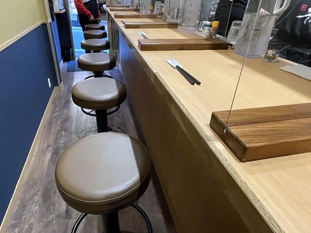 店内は厨房前に奥に長い真っ直ぐなカウンター7席。1席毎にアクリル板で仕切り設置。消毒液は券売機横に自動噴霧器配置。
