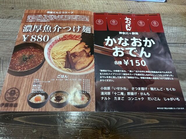 主なメニューは豚そば塩800円、豚そば醤油味800円、半ラーメン 500円、伊藤餃子450円、濃厚魚介つけ麺880円、かなおかおでん1個150円、他。