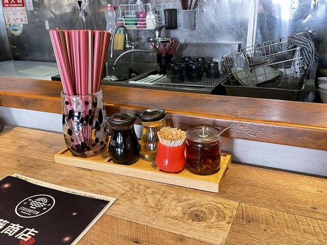 BGMはJ-POP。箸は洗い箸でエコ仕様。卓上調味料は醤油、酢、ラー油。