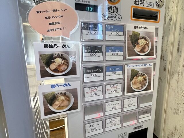 入店するとまず券売機で食券購入です。主なメニューは醤油らーめん800円、塩らーめん800円、チャーシュー丼300円、他。