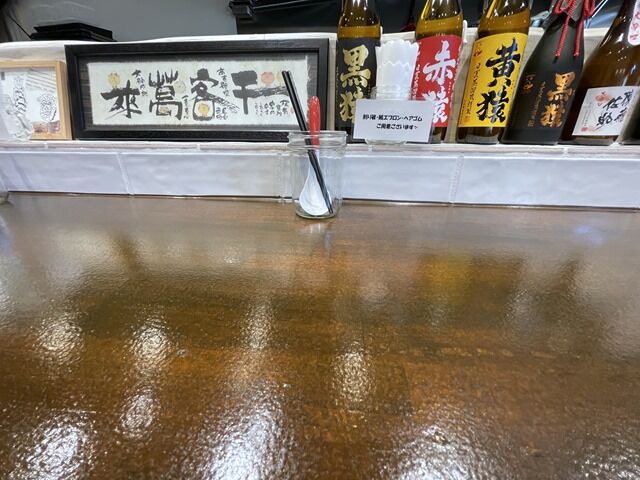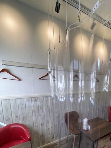 店内は厨房前に真っ直ぐなカウンター4席、2人卓x3。テーブル間は天井から吊り下げのビニールシートで仕切り、カウンターの席間は仕切り注文中。消毒液は券売機横に自動噴霧器設置。