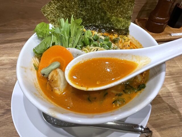 具は、セロリ、ひき肉に溶き卵、水菜、スライス大根、カットトマト、スライスニンジン、そら豆、ロースト粒にんにく、海苔、きざみ青ねぎ、等々。移転前やポスター画像とは別物でフレッシュな野菜がたっぷりトッピング。サラダ感覚でいただけるヘルシーな一杯に大進化。