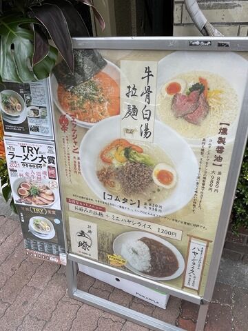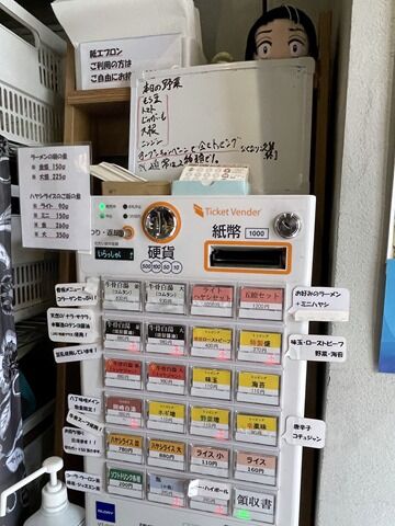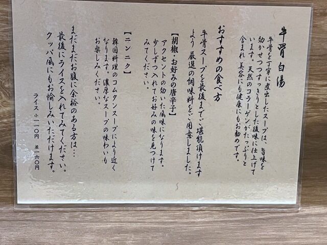 入店するとまず券売機で食券購入です。主なメニューは、牛骨白湯(コムタン)並830円、牛骨白湯(燻製醤油)並880円、辛牛骨白湯(ユッケジャン)889円、岡崎白湯(八丁味噌メイン)880円、五瞭セット1200円、ハヤシライス並780円、他。