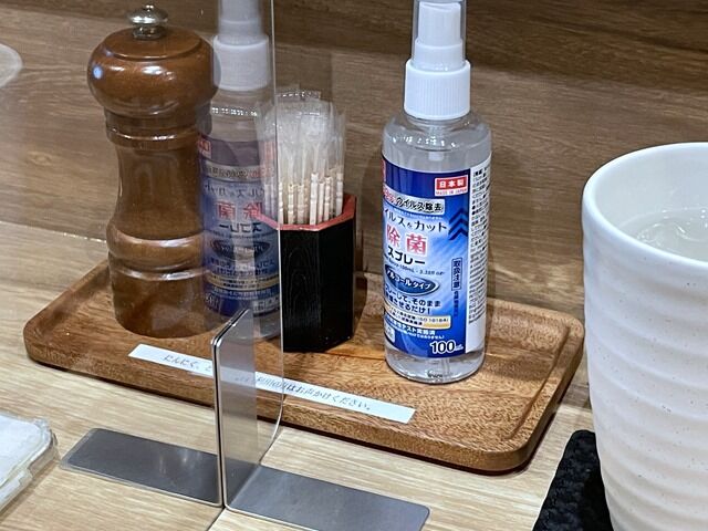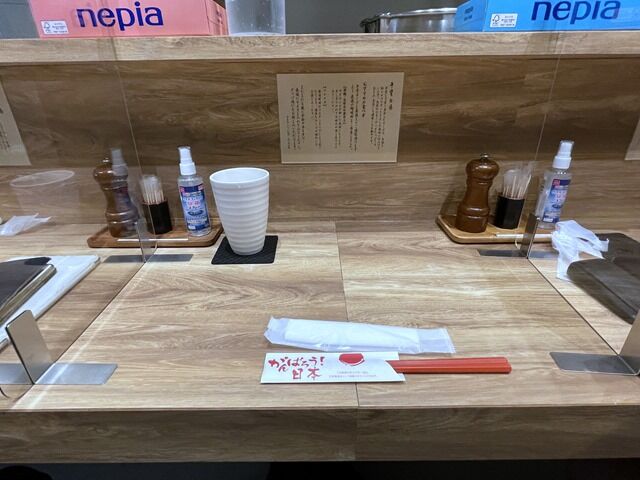店内は厨房を囲むL字型カウンター7席(6・1)。1席毎にアクリル板設置。消毒液は券売機横と各席に配置。