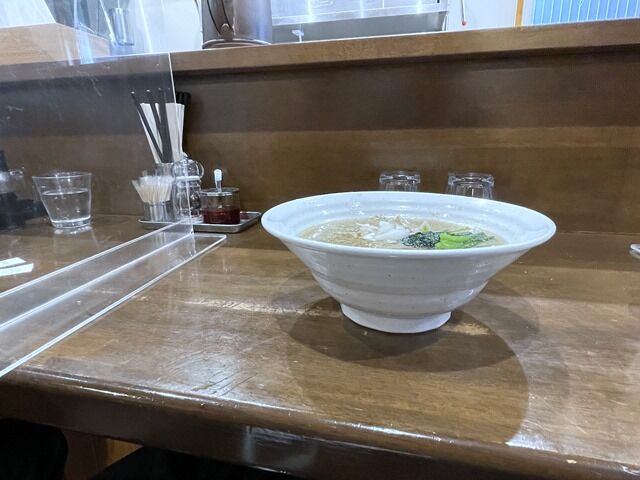 スタッフは店主さんと接客の男性。BGMはジャズ。箸は割り箸と洗い箸のW装備。卓上調味料はミル入りミックスペッパー。コップが永福系並にデカくて厚底で重いです。