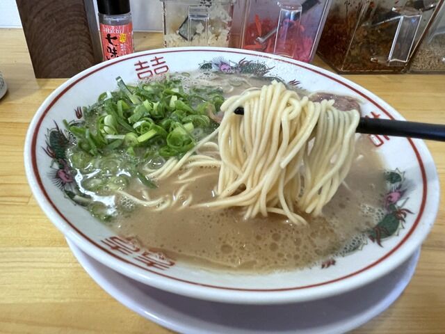 スープはドロっと濃厚な豚骨醤油味。豚臭さ、豚骨スメルは軽め。骨粉感がハンパなくこれぞドッ豚骨といった味わい。スゲえとしか言いようがなく、訪店がここまで遅くなったことを後悔。ヘヴィ級の重厚でごっつい武骨な圧倒的な存在感のある豚骨スープですごく美味しい!