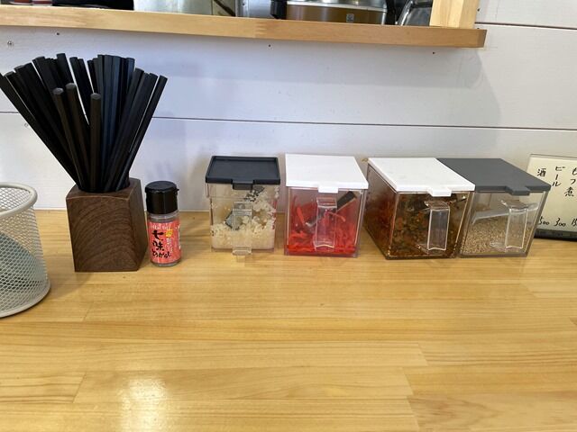 BGMはテレビ?ラジオ? 箸は洗い箸でエコ仕様。卓上調味料・薬味はHachi七味唐辛子、おろしにんにく、紅生姜、辛子高菜、煎り胡麻。