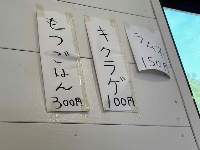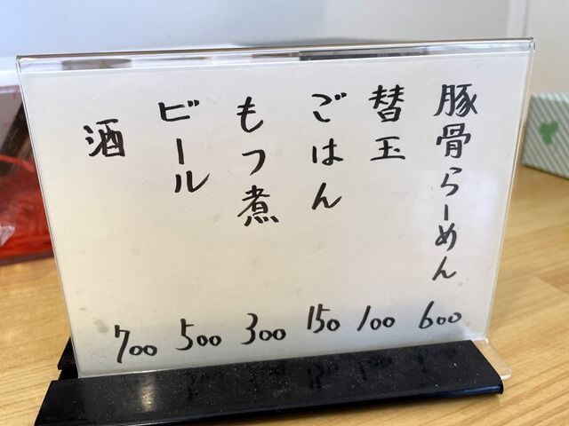 券売機はなく後会計制。主なメニューは豚骨らーめん600円、替玉100円、もつ煮300円、キクラゲ100円、他。