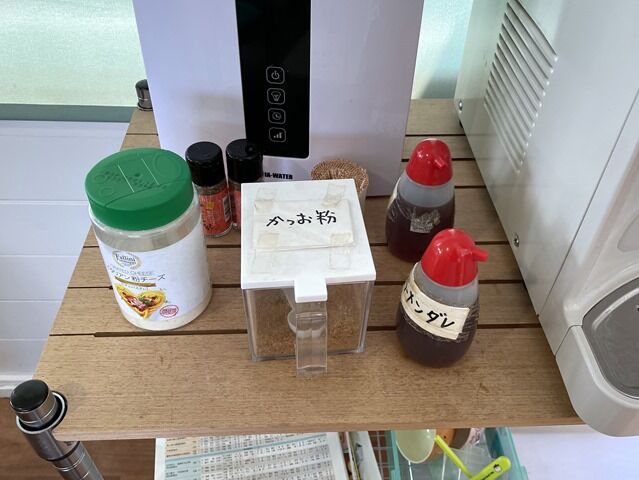 給水器横にイタリアン粉チーズ、かつお粉、ラーメンダレ。チーズやかつお粉は使いませんでしたが、豚骨ラーメンをイタリアン風や豚骨魚介に味変可能!?