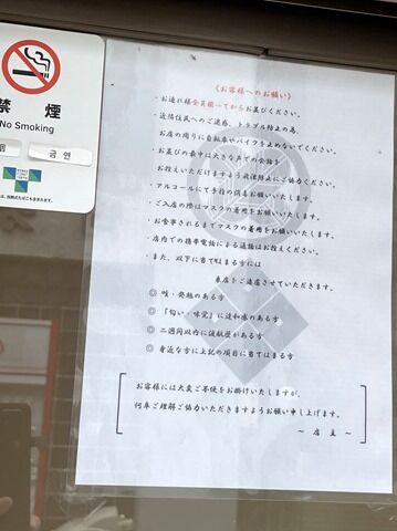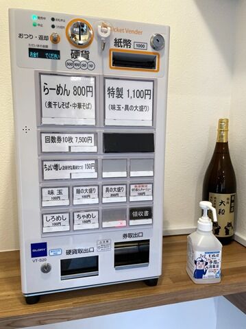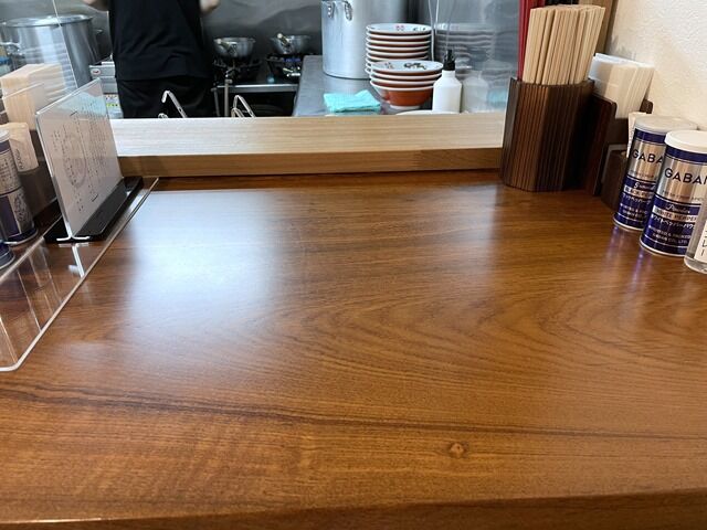店内は厨房前に真っ直ぐなカウンター7席、2人卓x1。カウンターは1席ごとにアクリル板の仕切りあり。消毒液は外の入口前、券売機横、卓上と随所に配置。スタッフは男性2。