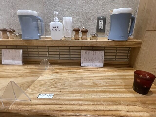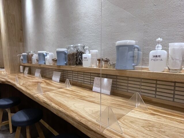 席は壁に向かったカウンター7席、反対側の壁に向かったカンター5席、奥に4人卓x2。カウンターは1席毎にアクリル板の仕切りあり。