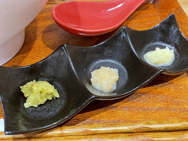 「調味料はメニューの裏を見て下さい」とのことで、確認すると柚子胡椒、焦がし入りにんにく、レモン生姜。