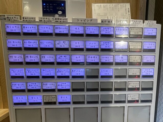 入店するとまず券売機で食券購入です。主なメニューは【蛤×帆立】塩らぁめん880円、【鶏×豚×ポルチーニ茸】醤油らぁめん880円、【親鶏×豚×昆布水】つけめん1000円、【親鶏×豚×煮干し】濃厚醤油らぁめん880円、お茶漬け推奨丼350円、特製半チャーハン350円、他。