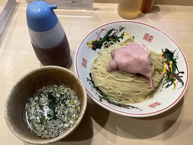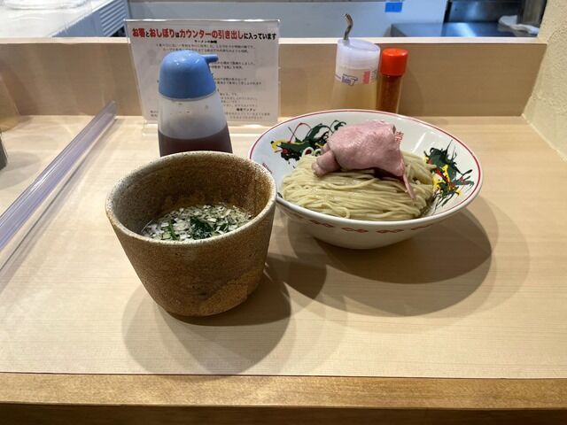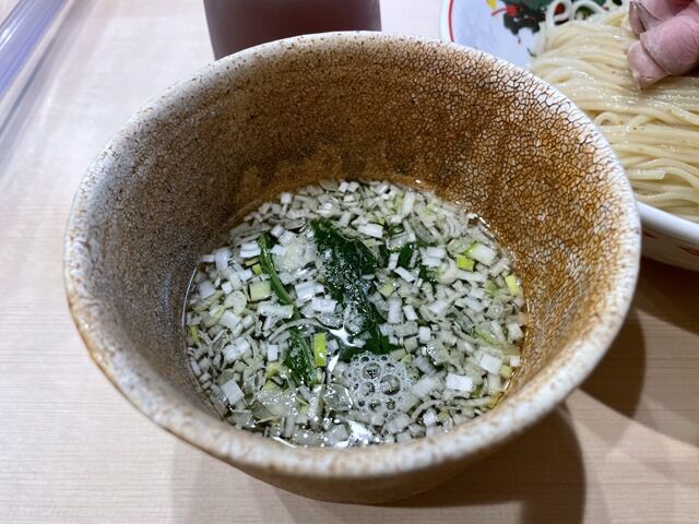 つけ汁の器が茶道の茶碗のような特徴的な和食器で着丼。提供時「スープ割り出来ます」のアナウンスあり。同時に提供されたのが「出汁差し」。「途中で味が薄くなったら出汁を足して下さい」とのこと。