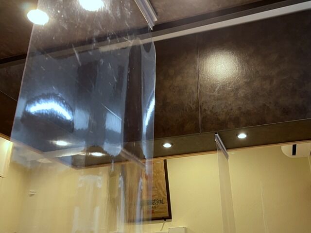 席は凹字型カウンター7席(3・1・3)。1席毎に天井から吊り下げ式のビニールシート設置。