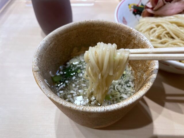つけ汁の中にはみじん切りのねぎ、青菜。つけ汁はさらさらの清湯。白醤油でしょうか、ほんのり甘くて出汁感たっぷり。まずは昆布水をまとった麺だけ一口。小麦の風味・香りが馥郁と香ってとても美味しい!出来ればここに塩を付けて啜りたいです。