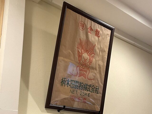 店内は奥が厨房で手前が客席スペース。壁面には店名の由来になった柄木田製粉の小麦粉「金龍」の粉袋がディスプレイ。