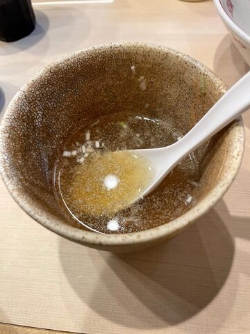 〆にスープ割りコール。いったんつけ汁の器が回収されて、寸胴からスープを注いでレンゲがトッピングされてリターン。魚介がぐわっと前面に出て和風にシフト。ほっこりと和みのフィニュッシュが出来ます。