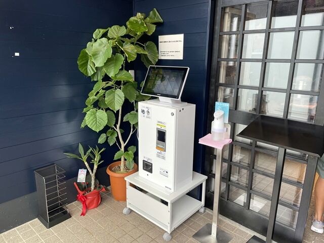 消毒液は券売機横と給水器横に配置。後客いっぱい、大箱店ですが常時外待ち発生。