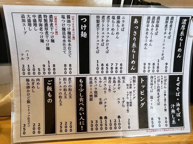 (あっさり系)ニラそば600円、醤油らーめん780円、煮干トリュフかけそば650円、煮干トリュフそば850円、