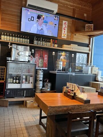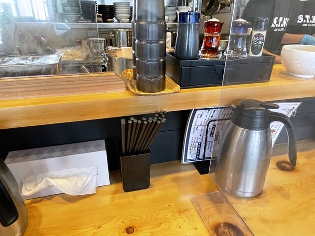 店内は厨房前に真っ直ぐなカウンター8席、8人卓x2。カウンターは1席毎にアクリル板設置。テーブルはグループの境にアクリル板設置。
