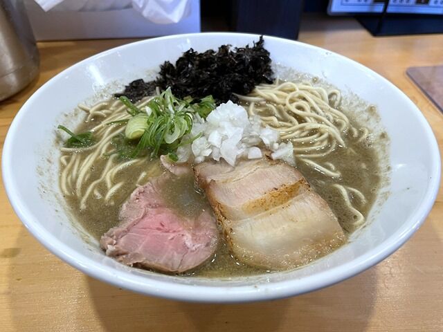 具はロース低温調理とバラ煮豚のチャーシュー2種、バラ海苔、きざみ九条ねぎ、きざみ玉ねぎ。