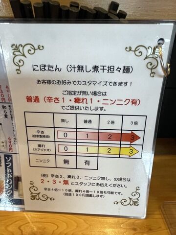 主なメニューは、(濃厚系)濃厚煮干そば900円、濃厚豚そば850円、濃厚みそらーめん900円、