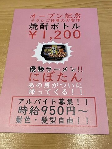 お隣は奥様でしたっけ!?さらにサポートの女性の3名体制。スタッフTシャツの「STNK」は「志S 奈そば 田T なN かK」でしょうか。シャップカード、裏はオープン記念焼酎ボトル1200円券。