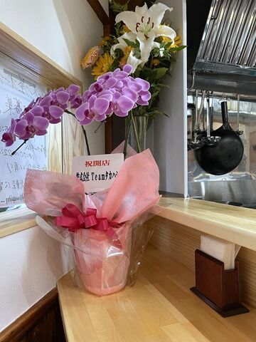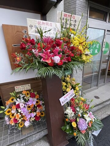 店頭開店祝花は、進化関口天守、noodle art gallery Ryota Tezuka、麺坊ひかり、麺や食堂、進化スタッフ一同から。