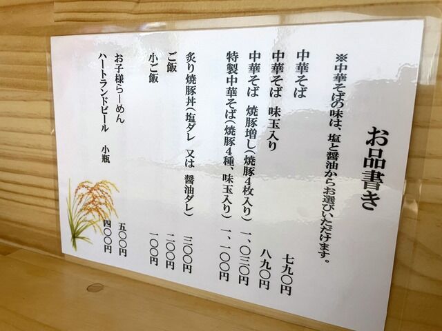 主なメニューは中華そば塩790円、中華そば醤油790円、炙り焼豚丼300円、他。