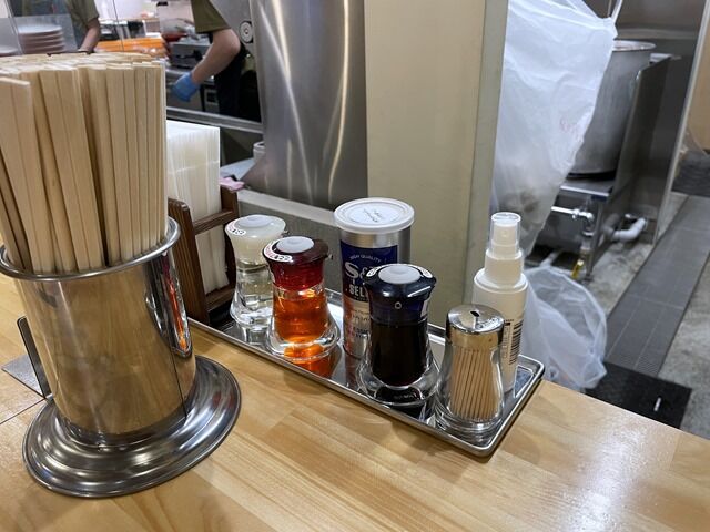 スタッフは厨房・ホールに男女合わせて5名。BGMは昭和初期〜中期のオールディズ昭和歌謡。箸は割り箸。卓上調味料は酢、醤油、ラー油、S&Bホワイトペッパー。