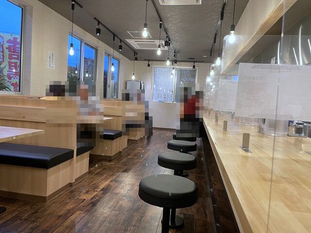 店内は厨房前に真っ直ぐなカウンター11席、ボックス式の4人卓x5。カウンターは1席ごとにアクリル板の仕切り設置。消毒液ほ調味料と一緒に卓上に配置。18:40頃到着で先客3、後客8。中華そばの方はぱらぱらと入店ですが、唐揚げの方はお客さんひっきりなしに来店。