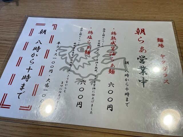 朝らぁのメニューは鶏熟成醤油らぁ麺600円、鶏塩らぁ麺600円、他。