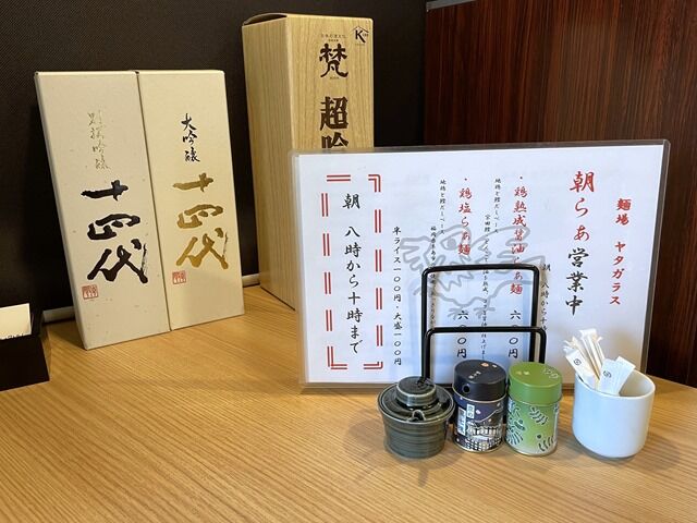BGMは昭和歌謡とラジオのW。箸は割り箸。卓上調味料は柚子胡椒、京の黒七味、京の山椒。