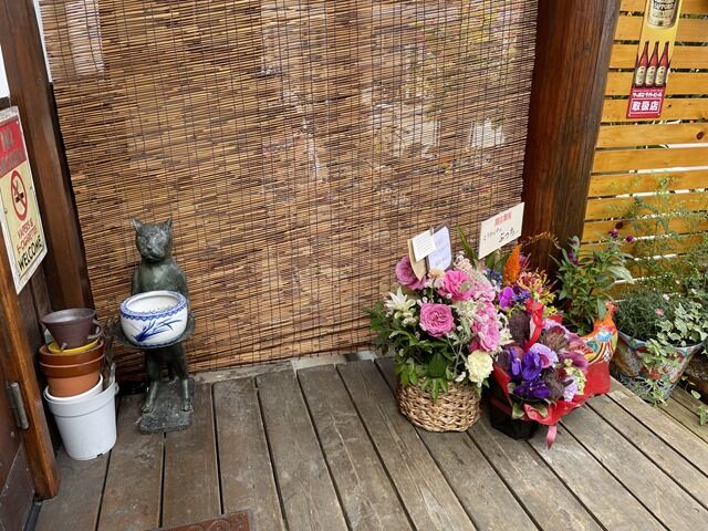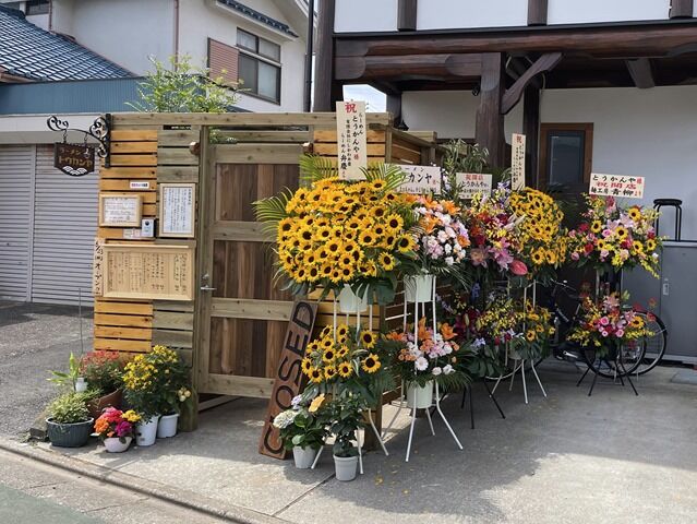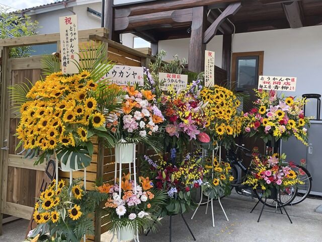 ちょっと早めの到着で1番海苔~w 店頭開店祝花はらーめん弁慶、炭火焼ホルモンナカジ、麺工房青柳から。