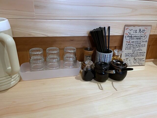 BGMはジャズ。箸は洗い箸でエコ仕様。卓上調味料・薬味はミル入りミックスペッパー醤油、辛子高菜、おろしにんにく、酢。