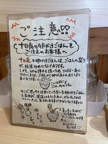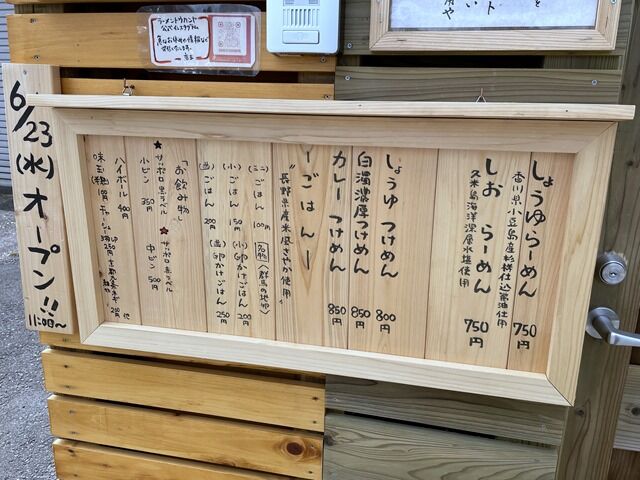 主なメニューは、しょうゆらーめん750円、しおらーめん750円、つけめん(200g)800円、白濁濃厚つけめん(200g)850円、カレーつけめん(200g)850円、名物卵かけごはん(小)200円、他。味噌らーめん・辛い味噌らーめん・辛味噌つけめんはいったんメニュー落ち。再開を機に価格改定してますが、それでも安い!