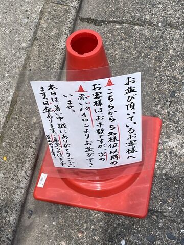 ウッドデッキから溢れた列びは5人まで。赤いパイロンに到達したら、コインパーキング横の次の赤いパイロンで列ぶ方式。