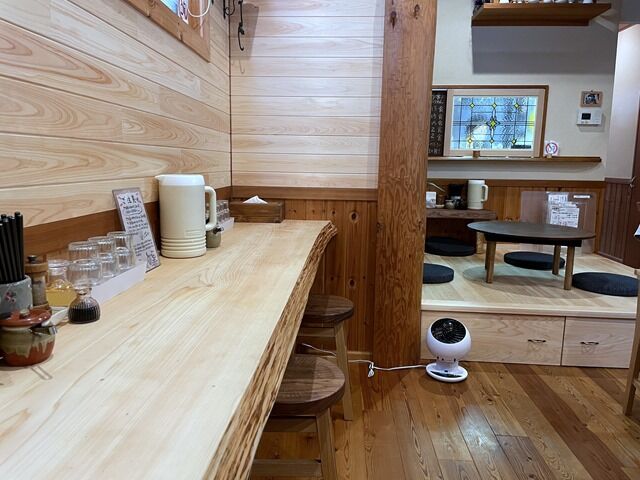 客席は壁に向かった カウンター4席、4人卓x1、小上がりに丸テーブルx1。