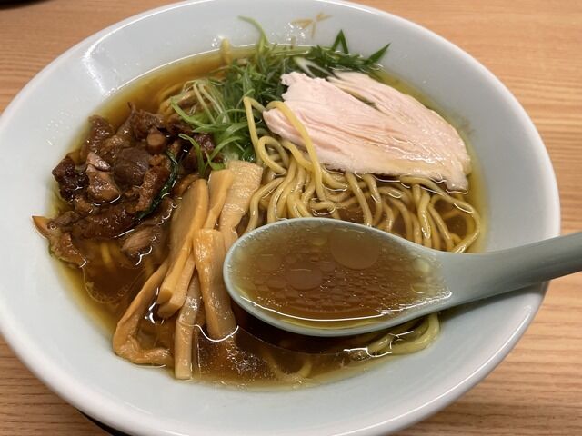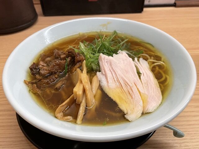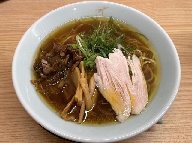 具は岡山県産森林鶏の胸肉を低温調理した鶏チャーシュー、親鳥を醤油で煮た煮鷄、九条ねぎ。煮鷄のコリコリとした食感が楽しくて旨いです。ミルフィーユ状に層をなした鶏胸チャーシューはしっとりと柔らかく、低温調理の鶏チャーシューの中でも群を抜く旨さ。