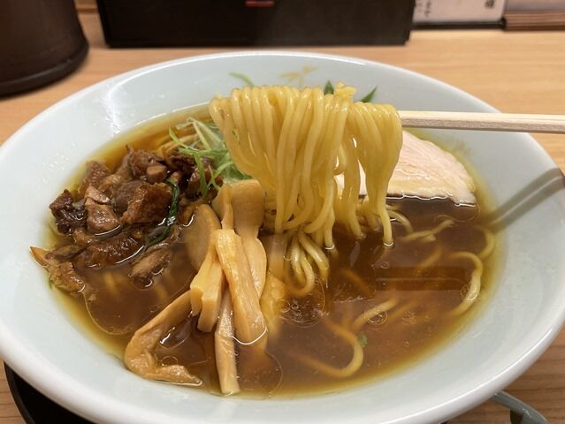 スープはさらさらの清湯醤油味。親鶏の鶏出汁と魚介のWスープ。老鷄を使ったスープは濃いうま味に溢れていてコク深い味わい。魚介が突出することなく鷄を引き立てるバイプレーヤーとして機能。香り高く豊潤でバランスに秀でた魅力的なテイストですごく美味しい!