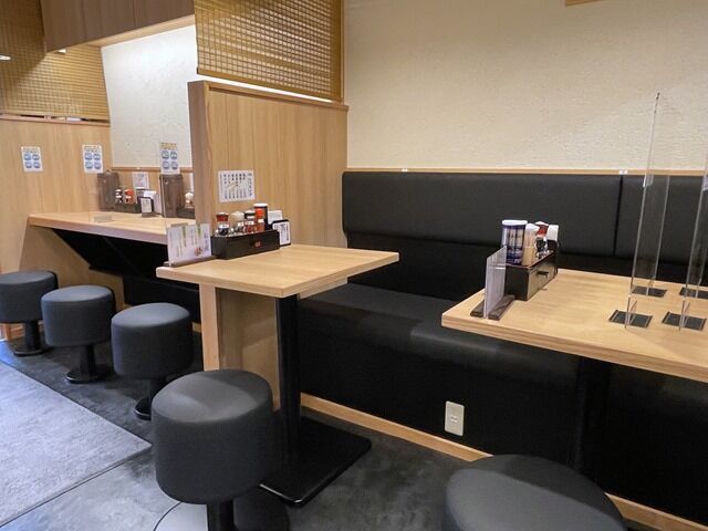 カウンターは1席ごとにアクリル板の仕切りあり。消毒液は入口入ってすぐに自動噴霧器設置。